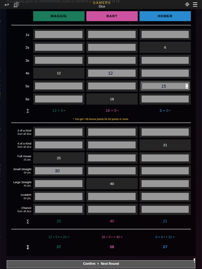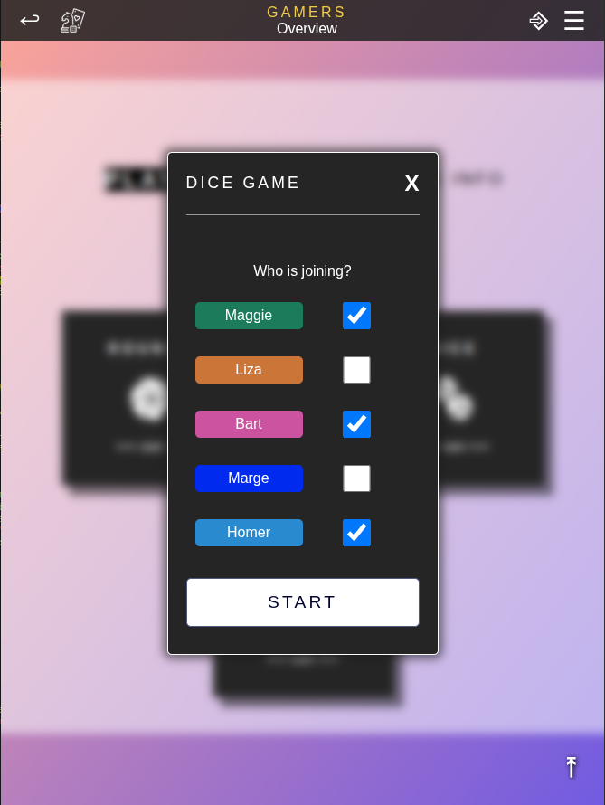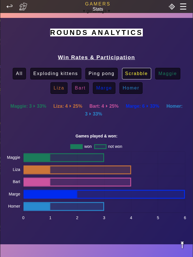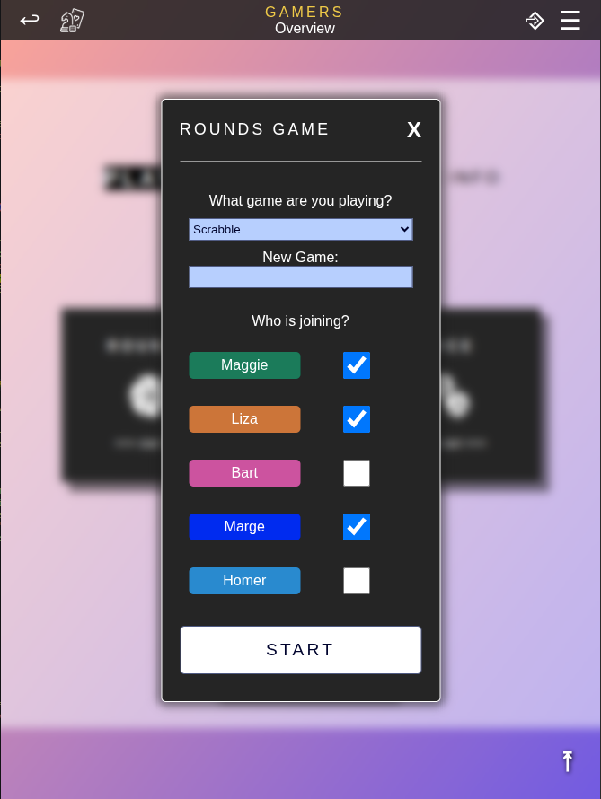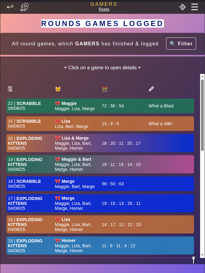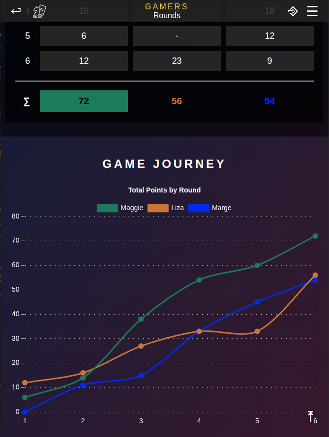 Rounds includes all round-based games such as board or card games, sports or party games. Each round you can enter points for every player. The winner is the player with the most points. This mode works for most types of games. Either you note down rounds (as in scrabble) or the results of multiple games you want to combine, e.g. cards or table tennis. You will be able to anayze each game title seperately, e.g. checking out who won most scrabble matches or what is your win rate in table tennis.