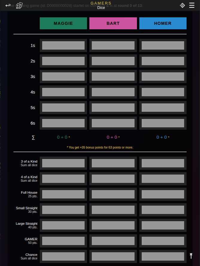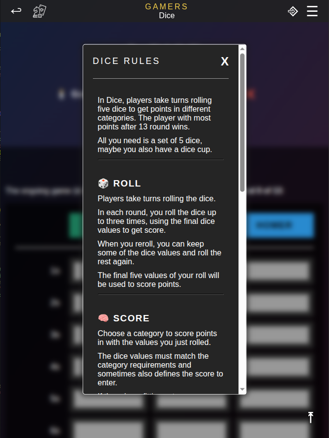 You might know this game as 'Yatzy' or 'Kniffel' - this is it. Players roll 5 dice to receive points in the given 13 categories. The categories are pre-defined, examples are 'Multiple 3's' or 'Full House'. The winner is the player with most points in total. Don't worry if you don't know the rules, Gamesbook will help you play it with ease.
