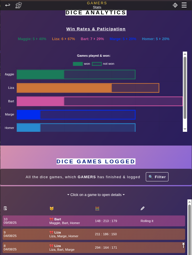 GamesBook offers analytics for your group. All players can login and revisit the groups' logged games and results. You can see how the players have performed, developed their gameplay or simply remember the fun you've had playing together.