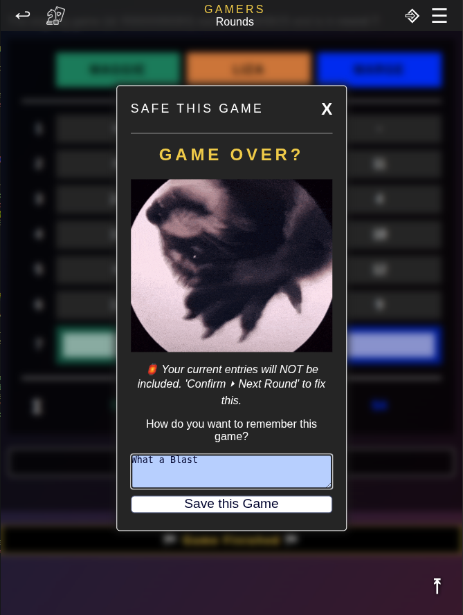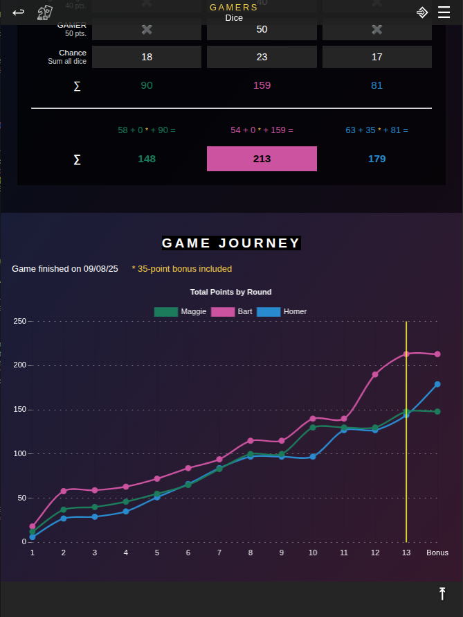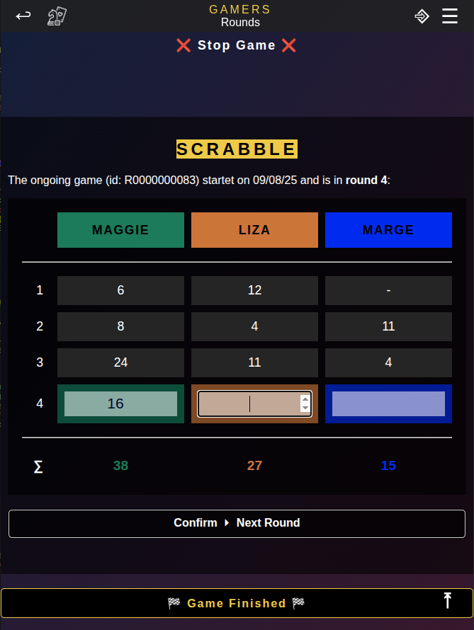 ⌑ Say you play Scrabble. This is a round-based, multiplayer game. You can have GamesBook open while you play and enter the points after each round or after a playthrough - you decide. Once you are done, you save the log of the Scrabble session. The game mode for this is 'Rounds'.