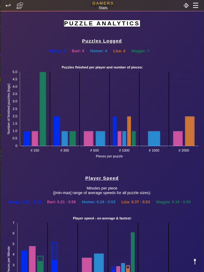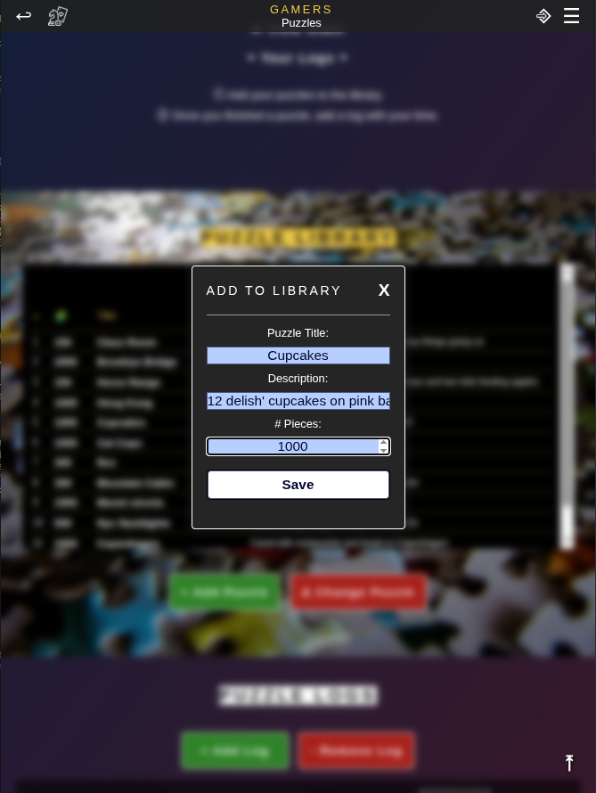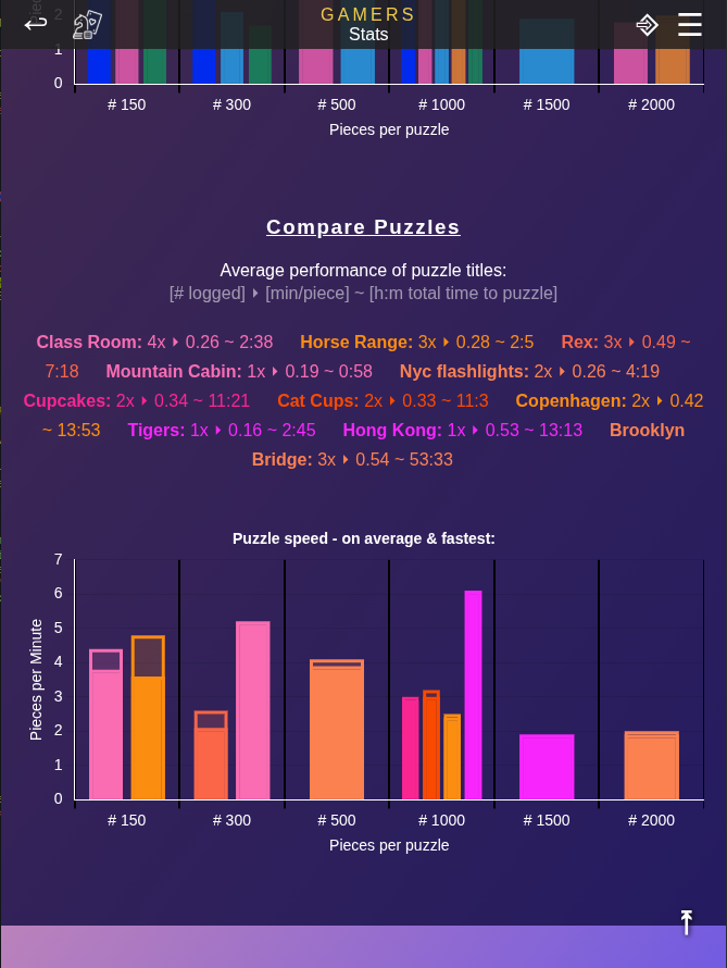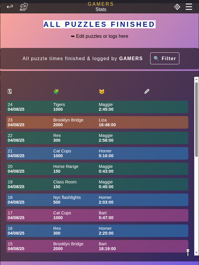 🧩 Challenge your (Jigsaw) puzzle skills! Add all your puzzles to the Gamesbook library and log the time it took you to finish them. You can then log your times in GamesBook in a easy way. Just add the puzzle once and then save logs each time you finish it. After a view entries you will be able to explore your stats and compare within your group or between different puzzles.